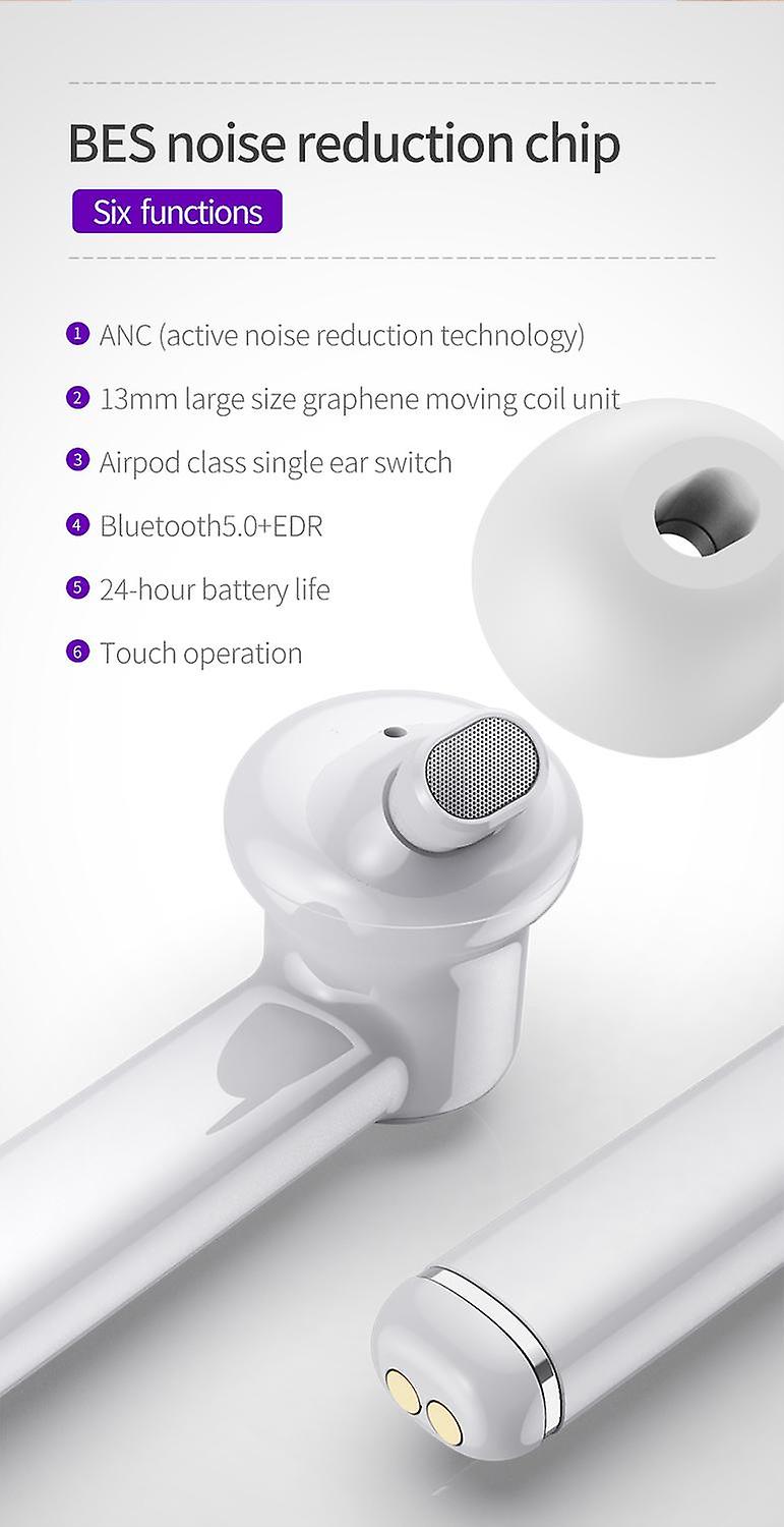 BH816 ANC True Wireless Earbuds BES2300 bluetooth 5.0 Active Noise Canceling Headphone TouchSpecification:[Product Name]: bluetooth Noise Cancelling Headphone[Chip]: BES2300 V5.0[Support Agreement]: HSP/HFP/A2DP/AVRCP[Charging port]: type-c[Noise reduction depth]: 25dB[Transmission range]: 10 meters[Headphone Talk Duration]: 8 hours[Approximate listening time]: 4-5 hours[Earphone battery]: 60mAh[Charging compartment battery capacity]: 500mAh[Charging times of charging compartment]: 3 times[Charging time]: 2h in charging compartment, 1.5 hours in earphone[Standby time]: 400 hours[Waterproof test]: IPX4[Product weight]: net weight 43g[Packing box weight]: 65g[Packing box size]: 9.5*9.5*6.5cm[Product color]: black, white[Support function]: Support automatic switch, support binaural call, support switch function, support Android and iphone/ipad/ipod battery display, support touch switch
