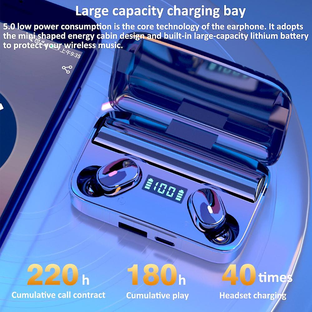 TWS Wireless bluetooth Headset In-ear Earphone Stereo Earbuds IPX5 Waterproof Headphone with Specifications: Wireless connection: bluetooth 5.0Noise reduction: CVC8.0bluetooth transmission distance: about 10mHeadset battery capacity: 50mAhBattery Charging case capacity: 2000mAhAutomatic boot up: supportAutomatic matching: supportBattery life:220 hours or so ( to be used with charging cabin)Phone calls time: 180 hours or so(to be used with charging cabin)Charge the headset: 40 times or soInput current: 5V 1AMagnetic function: Magnet chargingOperation mode: Sensitivity keyWeight: 100g Product functions: 1.Play/Pause (light touch the left earphone once)2.Answer/Hang up (light touch the left earphone once)3.Summon Siri (long press the left earphone for 1 seconds)4.Volume reduction ( Touch the left earphone three times)5.Switch the previous song (touch the left earphone twice)6.Turn On/Off ( Long press the earphone for 5 seconds) Charging method: 1.Earphone charging: Put the earphone in the charging compartment and close the lid, the earphone will automatically charge, the earphone will light upred when charging, and turn off when fully charged.2.Charge cabin charging: After connecting the cable, the red light in the charging cabin lights up,and the red light goes out when fully charged. Package Included: 1 x earphone set1 x charging case