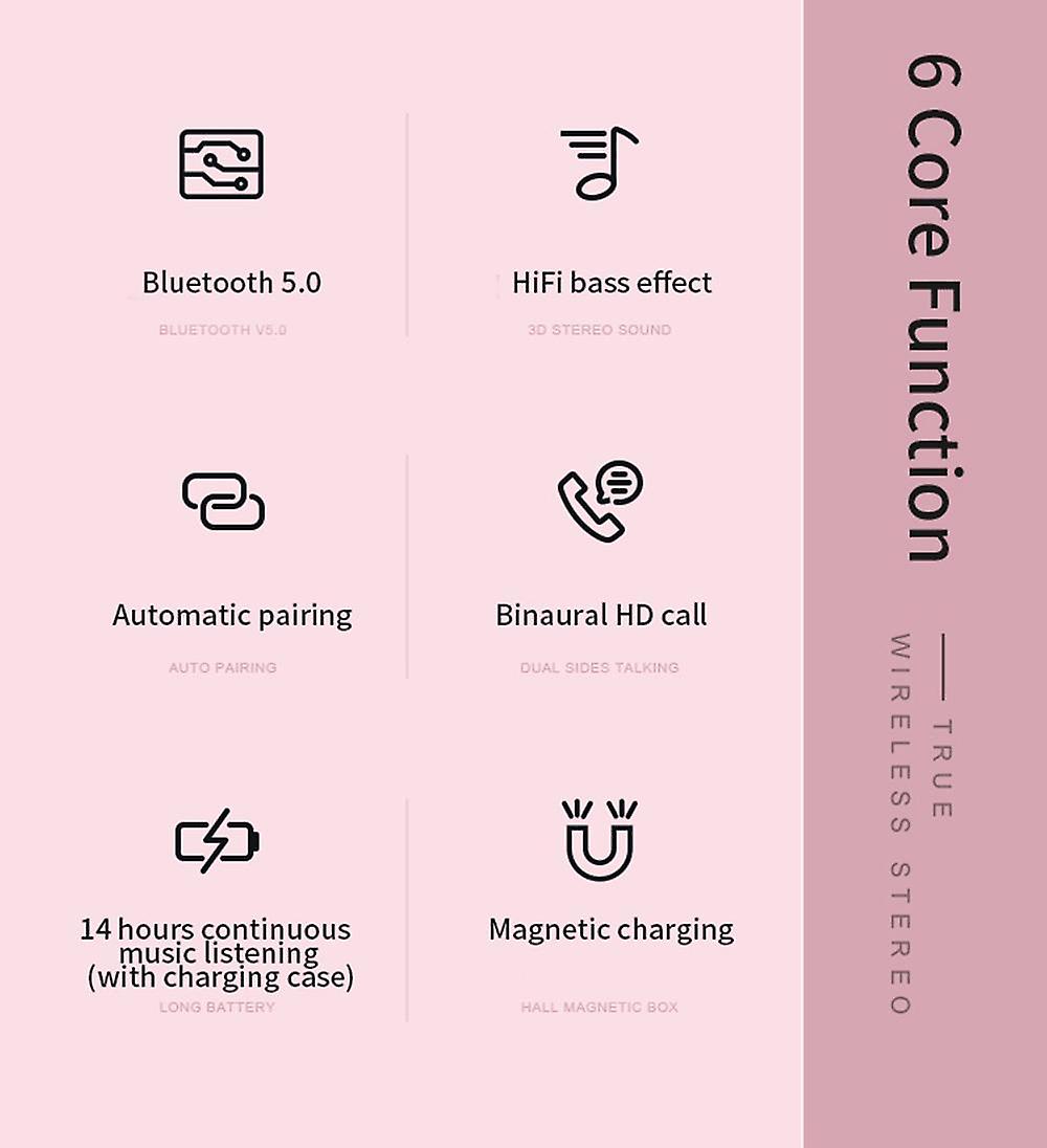 D021 TWS bluetooth 5.0 Earphone Fashion Macaron Colorful Mini Earbuds Stereo Music Headphone Specifications: General Specification Brand Model D021 Color Black, White, Pink, Grey, Blue Wearing Type In-ear Material ABS+PC Net Weight (g) 50g Dimensions (cm/ inch) 10*10*3cmTechnical Parameters Microphone Yes bluetooth Version V5.0 Transmission Distance 10m Impedance 32Ω Frequency Response 20-20kHz Battery Capacity Earphone: 40mAh*2, 3.7V Charging box: 500mAh, 3.7V Charging Time (h) 1h Talking Time 4h Working Time (h) 3-4h Standby Time (h) 80h Package Included: 1* D021 TWS bluetooth 5.0 Earphone with Charging Box 1* USB Charging Cable 2 pairs of Eartips