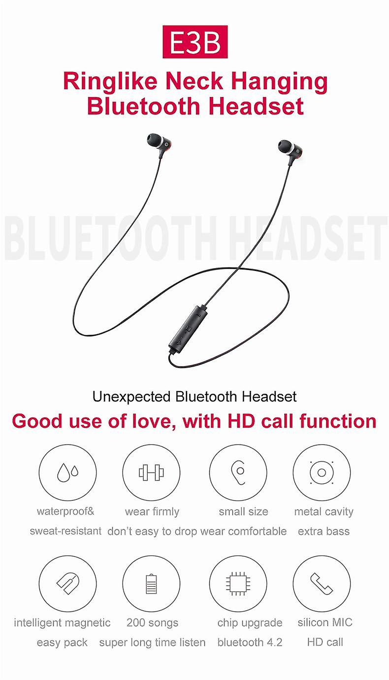 E3B Wireless bluetooth Super Bass Headphones In-ear Neckband Earphone for IOS Android PhonesSpecification: Item type: bluetooth Headphone Transmission scope:10 meters Battery capacity: 60 mAh polymer Play time: 4 Support function: Voice call, for iOS battery display; bluetooth protocol: 4.2 Workable distance: 10m (barrier-free space) Charging hours: 1.5hours Charging voltage: DC 5V Sensitivity: 98dB +/- 3dB Frequency response: 20-22000Hz How to connect this earphone to your phones: For you use this earphone first time, Please follow those step: 1. Open your phone bluetooth button 2. Press the ON/OFF button more than 6 seconds till both of the red and blue led bright 3. Wait your phone find the "E3B" earphone 4. If your phone found the "E3B" device, please click it, then your phone will connect it auto Features: [bluetooth 4.2 & Hi-fi Stereo Sound]: Latest bluetooth 4.2 ensures fast and stable signal transmission; Supports two devices connection simultaneously; Advanced noise cancelling technology, delivers crystal clear sound [Secure & Comfortable Fit]: Ergonomically designed with inclined angle to fit your ear canal and reduce noise. Meanwhile, customizable ear-tips(S/M/L) and ear-hooks included, bring you a comfortable and secure wearing experience [Convenient In-line Buttons]: With in-line microphone and volume buttons, the headphones enable you to make hands-free calls and manage music easily. [Long Battery Life]: 60mAh rechargeable battery, supports 4-6 hours talking/music time, and 120 hours standby time with only 1-2 hours charging. Just enjoy your wireless sport and music in peace of mind [Built-in Magnets & Lightweight]: Built-in magnets let you attach bluetooth headphones together when not in use, and wear like a necklace around your neck; Only 12g net weight makes you feel nothing; a convenient way to carry around for outdoors [Sweatproof]: Internal nano coating keeps the bluetooth headphones fully functional even when running in the light rain or sweating it out in the gym. [Wide Compatibility]: Compatible with bluetooth-enabled devices. Package includes: 1 x In-ear bluetooth headset 1 x Manuall 1 x Color box packaging