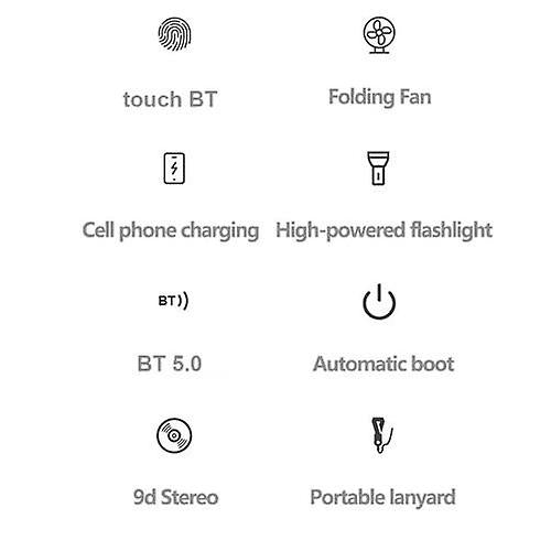 Features: BT headset with touching control, high definition communication between two ears. LEDs high definition power-display, know the remaining-power situation at-any-time. It is also a mini portable fan for comfort in summer. Large capacity lasting battery-life, can charge the mobile phone. With a flashlight function, illuminate the way home. The fan-blade is made of soft TPE material, with automatic-stop-protection design, which will not harm the hand. Two wind speed adjustment, using a button multi-function control. Take out the two earphones and automatically-start and automatically match. Open the BT of the phone and automatically connect back. The left and right ears are equipped with intelligent touching chip, which can be used to answer/hang up, play/pause and call the voice assistant with a touching. CVC8.0 intelligent noise reduction, the call is clear. Wear comfortable, wear for a long-time without pain. Hi-Fi sound quality, bring you a musical enjoyment. BT5.0, longer, more stable transmission, lower-power-consumption. Sound transmission has lower-delay and more stable transmission. Specifications: Item type: Headset Model: F7 Color: White, Black, Pink, Blue(Optional) BT version: 5.0 Charging-box capacity: 2000mAh Standby endurability: Approx. 220h The connection distance: 10m(barrier free) Touching control: Support Package weight: 280g/9.87ounces Package size: 180*90*50mm/7.08*3.54*1.96inches Packing List: 2 * Earphone 1 * Charging-box 6 * Pieces of earplugs 1 * Cable