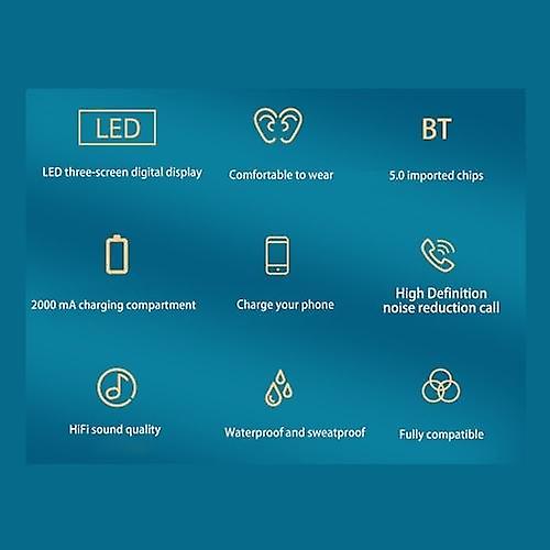 Features: 9D noise reduction, break through the tradition. LEDs three screen digital display, upgrade fingerprint touching control. Wide range-of-applications, as long as there is BT can be used. Magnetic-induction storage box, easy to use. Mini size and portable, convenient to carry and wear. Take the earphone out of the charging-box, automatically turn the phone on and automatically connect it, and automatically connect the phone back. IPX7 waterproof, can also be worn during exercise. With convenient charging-box, it can last longer. The high-capacity charging-box can not only charge the headset, but also charge the mobile phone. Dual-ear high definition call, using CVC8.0 and DSP intelligent noise reduction call. Intelligent electric display, can know the remaining-power. BT5.0 upgrade chip, more stable transmission, easier connection. Call up voice assistant with one-button, support Siri/ Android voice assistant. Double ears separate design, one-and-double free switch. Sound no delay, more enjoyable for games. Multi-function button, easy to control without pain.