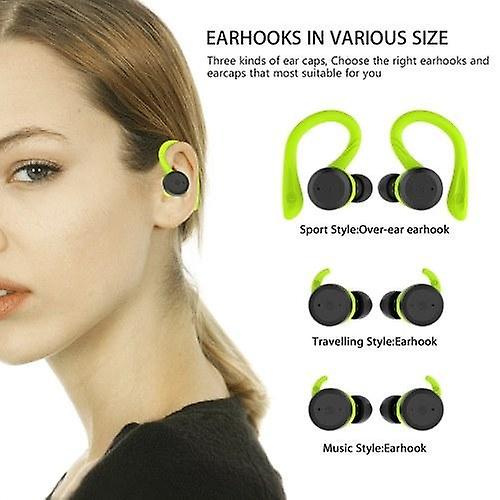 Specifications: Earbuds: Color: Black, Green (Optional) BT Version: V 5.0 Dual Mode Distance: 15-20 Meters Battery: Li-battery 60mAh Frequency Range: 20-2,0000Hz Impedance: 16Ω±10% Full Charging Time: 1.5 hours Play Time: About 4-6 hours (Maximum Volume) Earpiece Weight: 7.5g / 0.26oz Charging Case: Battery: Li-battery 650mAh Full Charging Time: 2 hours Input: 5V 500mA Output: 5V 200mA Dimension: 50 * 40 * 25.5mm / 1.97 * 1.58 * 1.0in Weight:55g / 1.94oz Package Size: 11.8 * 8.3 * 5.1cm / 4.65 * 3.27 * 2.01in Package Weight: 165.6g / 5.84oz Package List: 1 * TWS Earbuds 1 * Charging Box 1 * Charge Cable 2 * Earphone Hooks 2 * Pair of ear caps