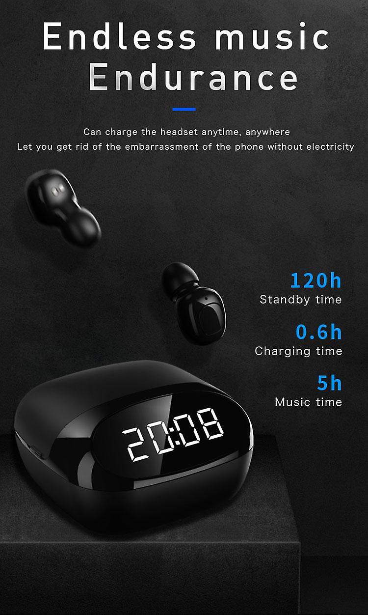 XG29 TWS LED Display Clock Wireless bluetooth Earphone Stereo Sport Music Headphones with HDSize Conversion Inches Centimeters Please according to your own measurements to choose your suitable size. The tags inside the items will show in our Asian (Type) size. Specification: Brand:Bakeey Model:XG-29 Imdepance:32ᅫᄅ Frequency:20-20KHZ Rated Power:3mW Sensitivity:98dB Talk Time:3H Music Time:3.5H Standby Time:120H bluetooth Version:5.0 bluetooth Chip:BT5376 Transmmition Distance:10M Input:93mW Power consumption:15-19mAh Charging Time:Earphone:0.8H Charging Case:1.5H Battery voltage:32-4.2V Battery:Earphone:50mAh Charging Case:600mA Input earphone current:5V/100mA Package: 2*XG-29 bluetooth Earphones 1*LED clock charging box 1*User manual 1*USB cable 2*ear caps