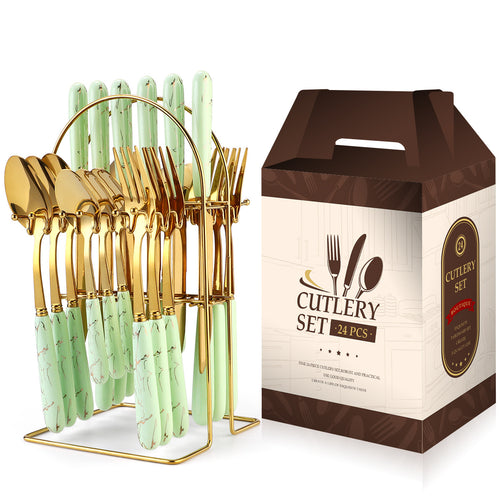 304 Stainless Steel Flatware Sets Vintage Porcelain Handle Stainless Steel Gold Plated 24-Piece Gift Box Green Blue
