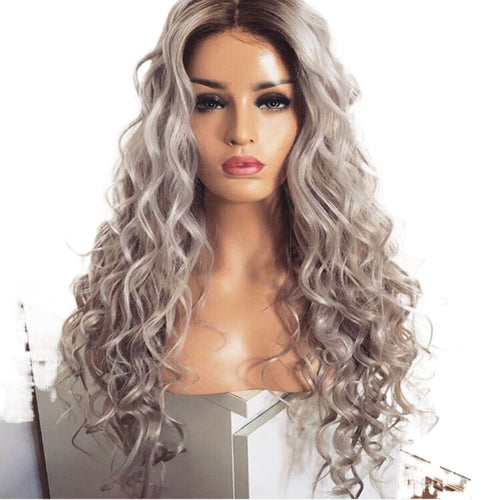 Women Wig Silver Gray Center-Parted Bangs Long Roll Wave W455