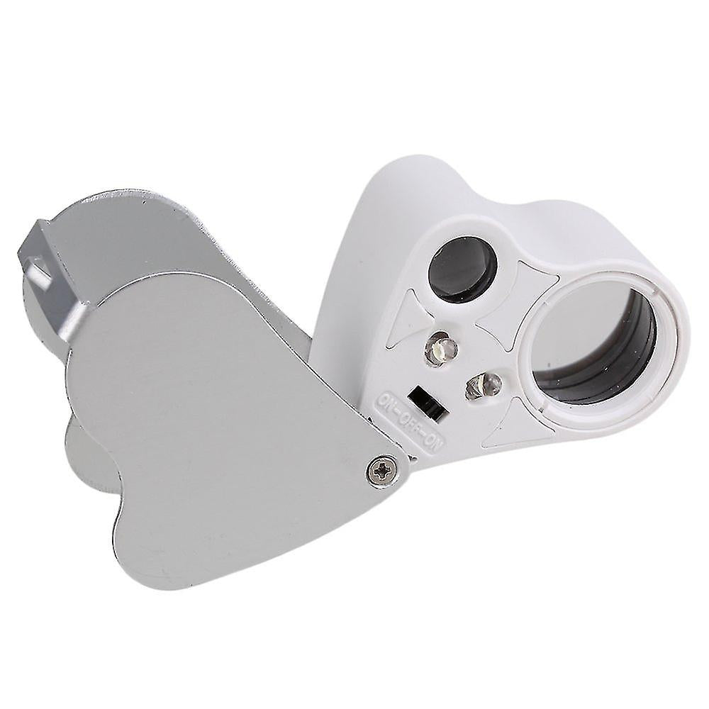 Multiples: 30 times larger lenses, 60 times smaller lenses Color: silver white Material: aluminum alloy casing, optical acrylic lens, etc. Effective diameter of the lens: small lens 12mm, large lens 22mm Magnifying glass size: after folding 53x 39 x 29 mm Function: With three 1.5V LR1130 button batteries (products already have batteries) Two LED white lights, one for each of the two lenses. The battery is detachable and the handle can be rotated Remarks: This product is not suitable for reading and reading. The effective diameter is only one dollar coin. The magnifying glass with large multiple diameter is small. Uses: 1. Inspection, processing, installation and repair of various operations in the electronics industry. 2, facial skin, pore observation, manicure, ear picking, etc. in the beauty industry. 3. Sculpture and appreciation of art. 4. Inspection and repair of cameras, clocks, etc. 5. Work of dentists, tailors, embroidery, etc. 6, financial, fiscal, philately, jewelry, printing, agriculture and other product characteristics. Package including: 1pcs Jewelry Identification Magnifying Glass 1pcs Twist