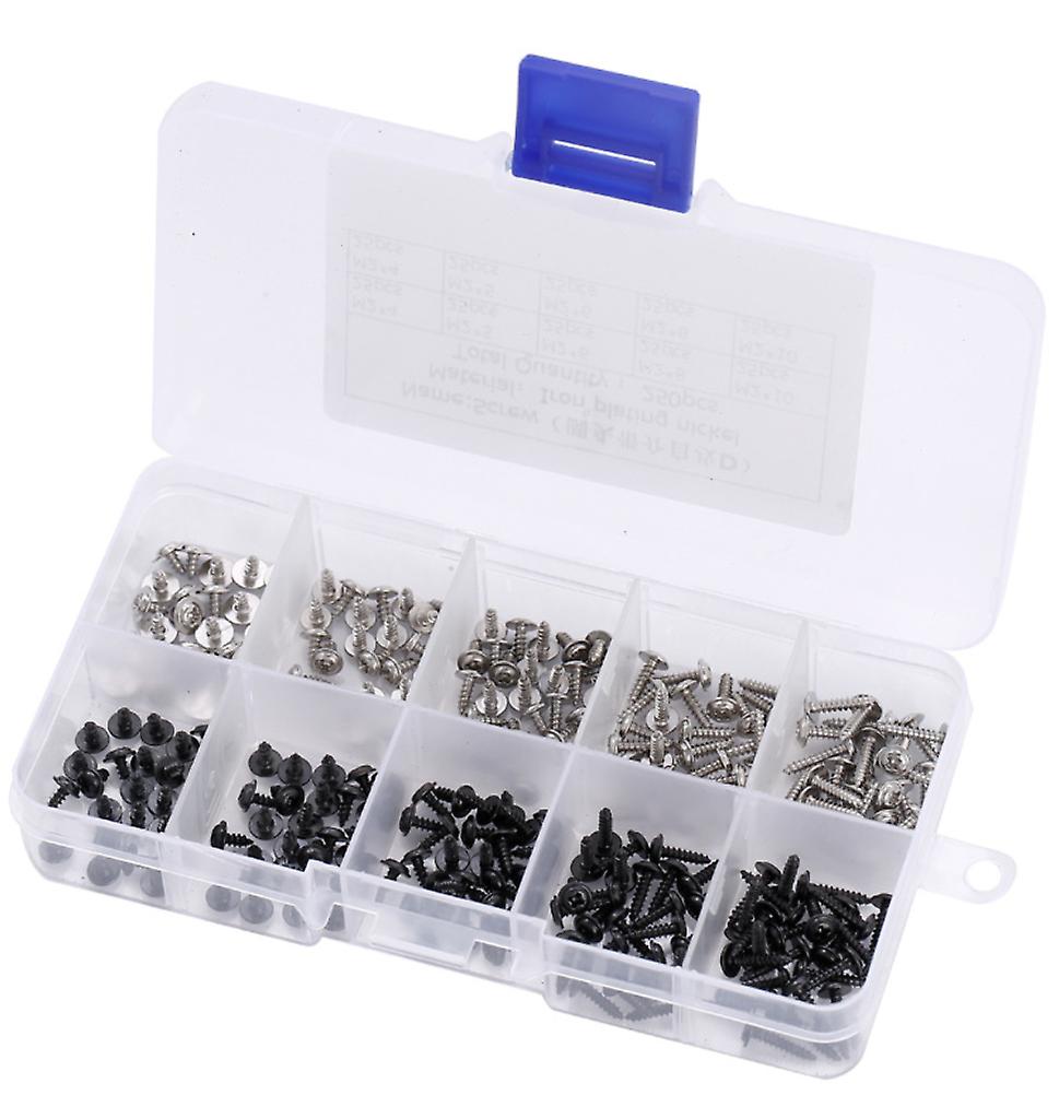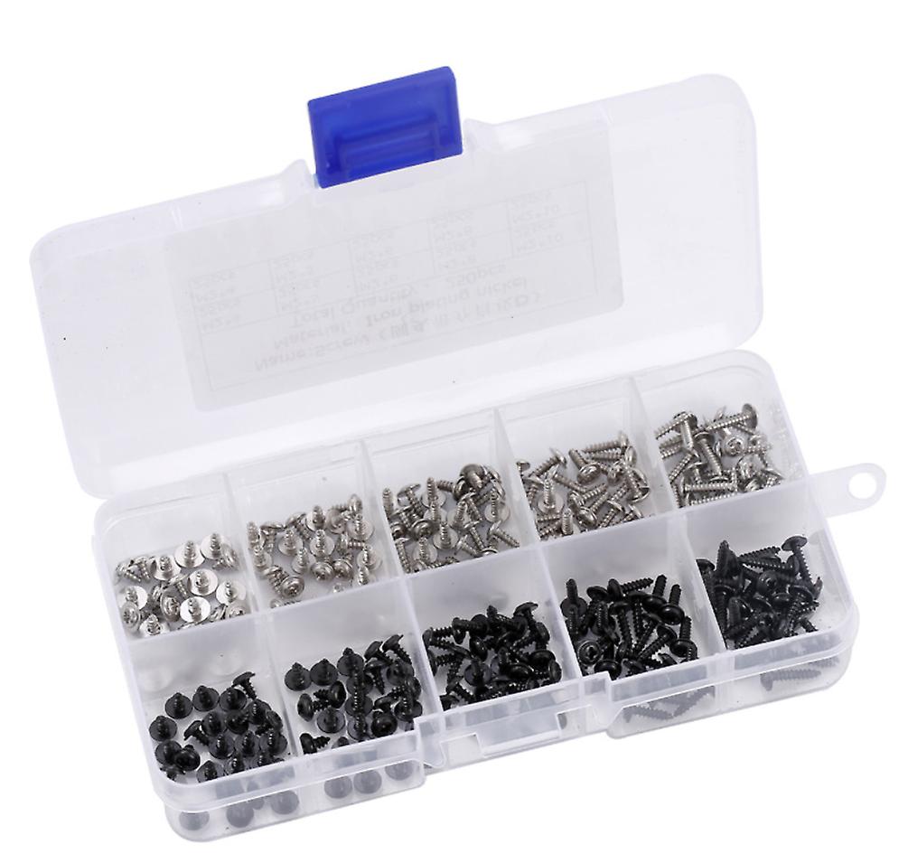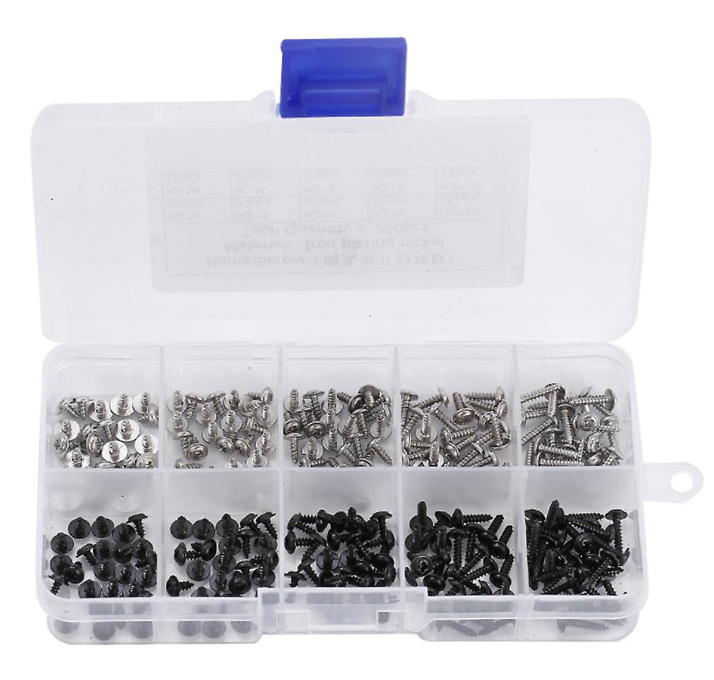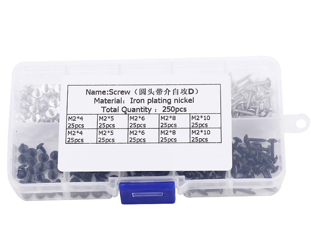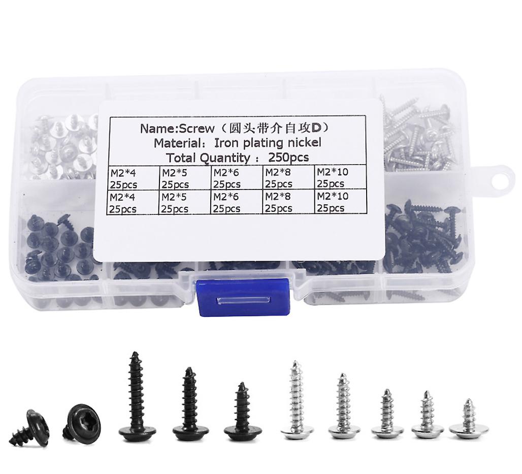 Feature:***** Self-tapping screw set with round head.***** 5 styles are more complete.***** M2*4 black 25pcs+silver 25pcs***** M2*5 black 25pcs+silver 25pcs***** M2*6 black 25pcs+silver 25pcs***** M2*8 black 25pcs+silver 25pcs***** M2*10 black 25pcs+silver 25pcs